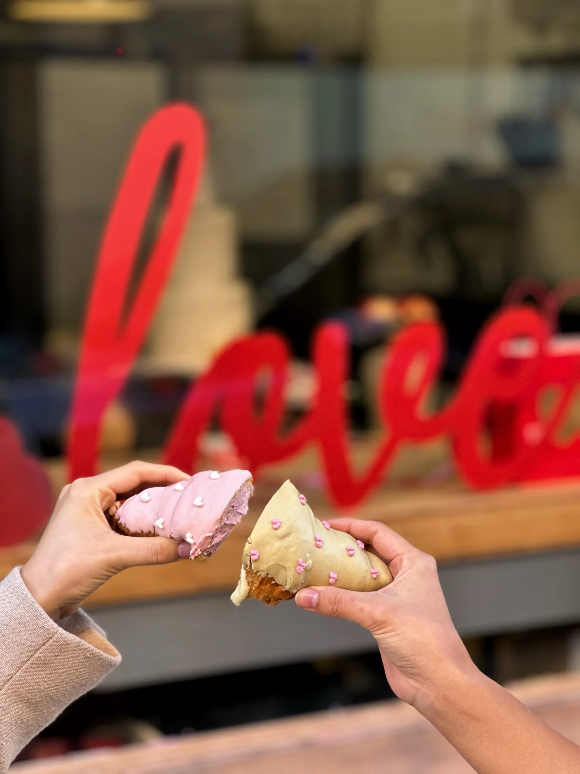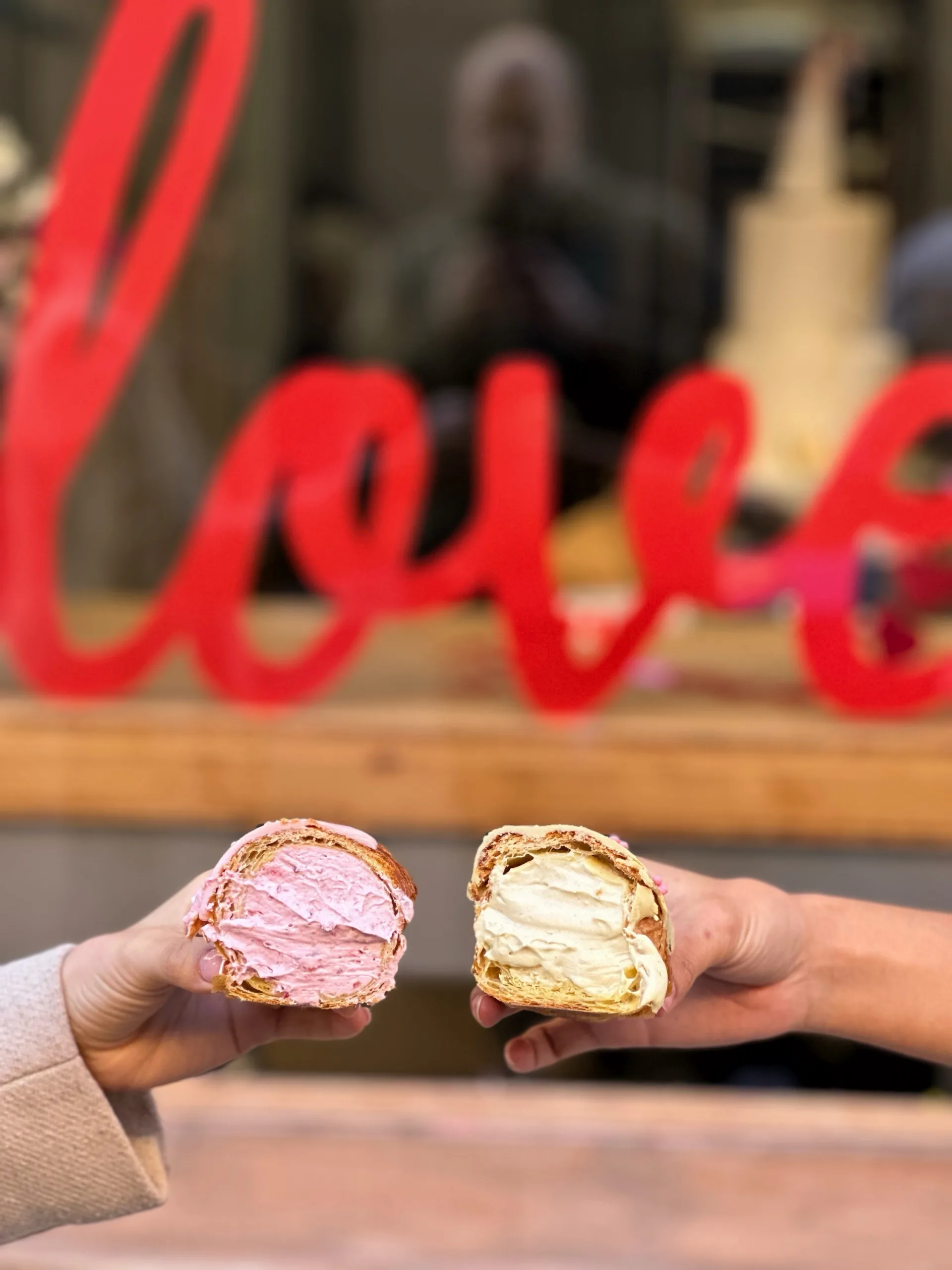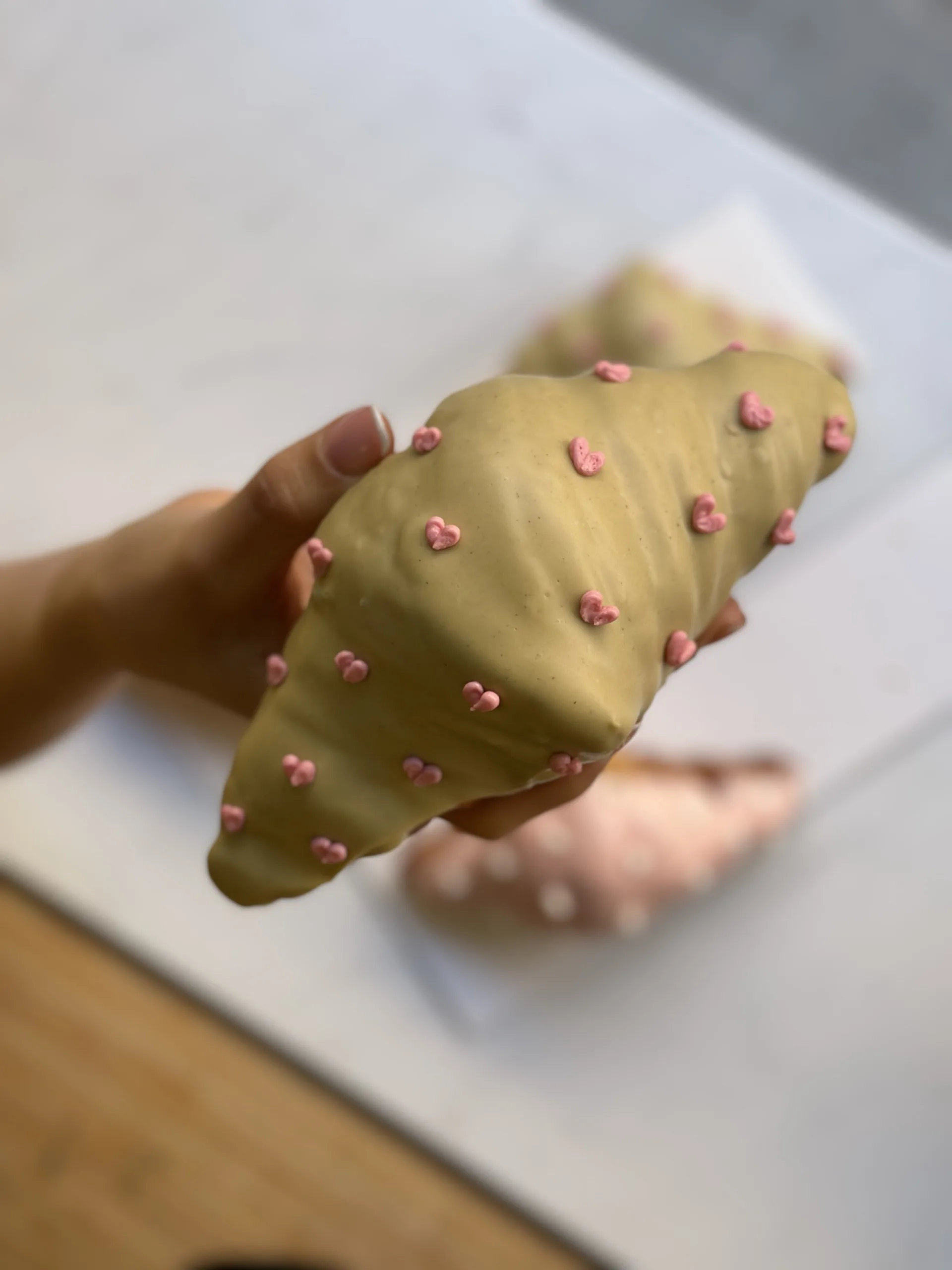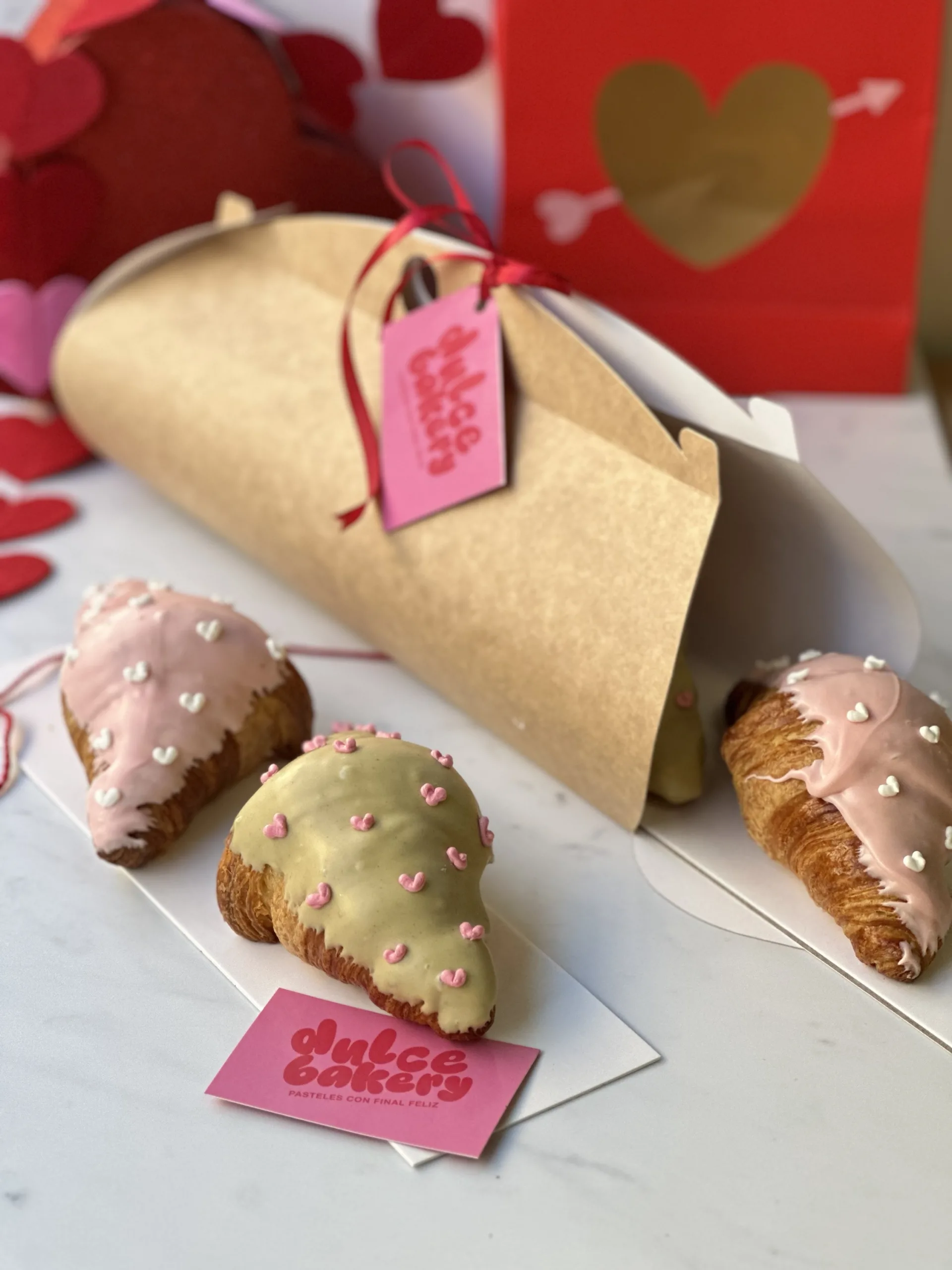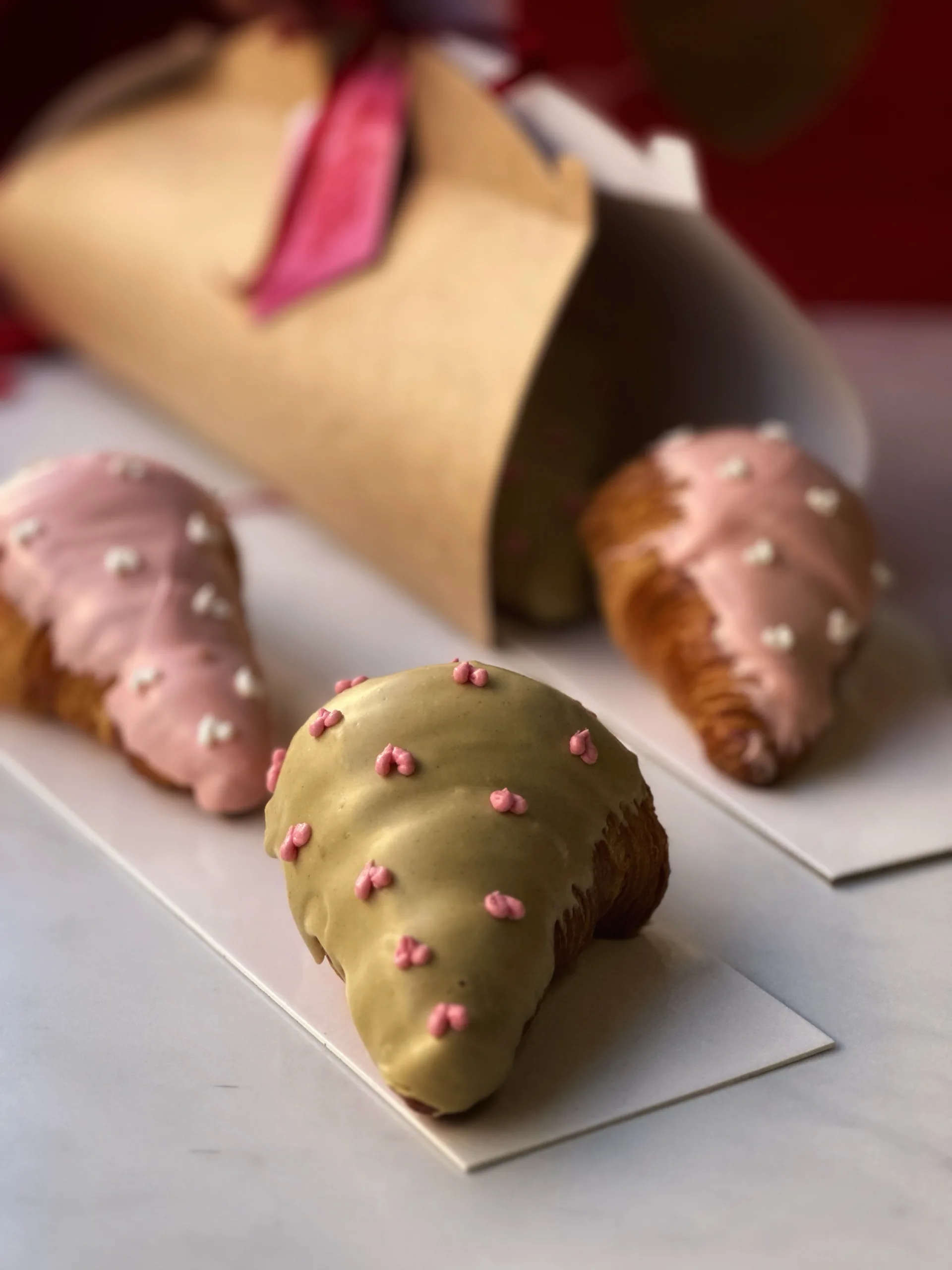 Dos croissants rellenos con mucho amor, croissant con cremoso de pistacho y baño de chocolate blanco y pistacho, croissant con cremoso de frutos rojos y baño de chocolate blanco rosado. Pack indivisble, se entregan en una caja.