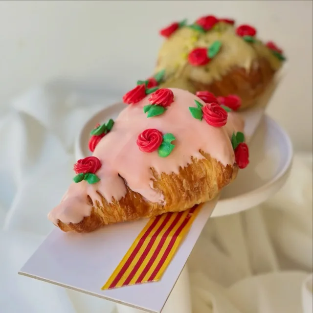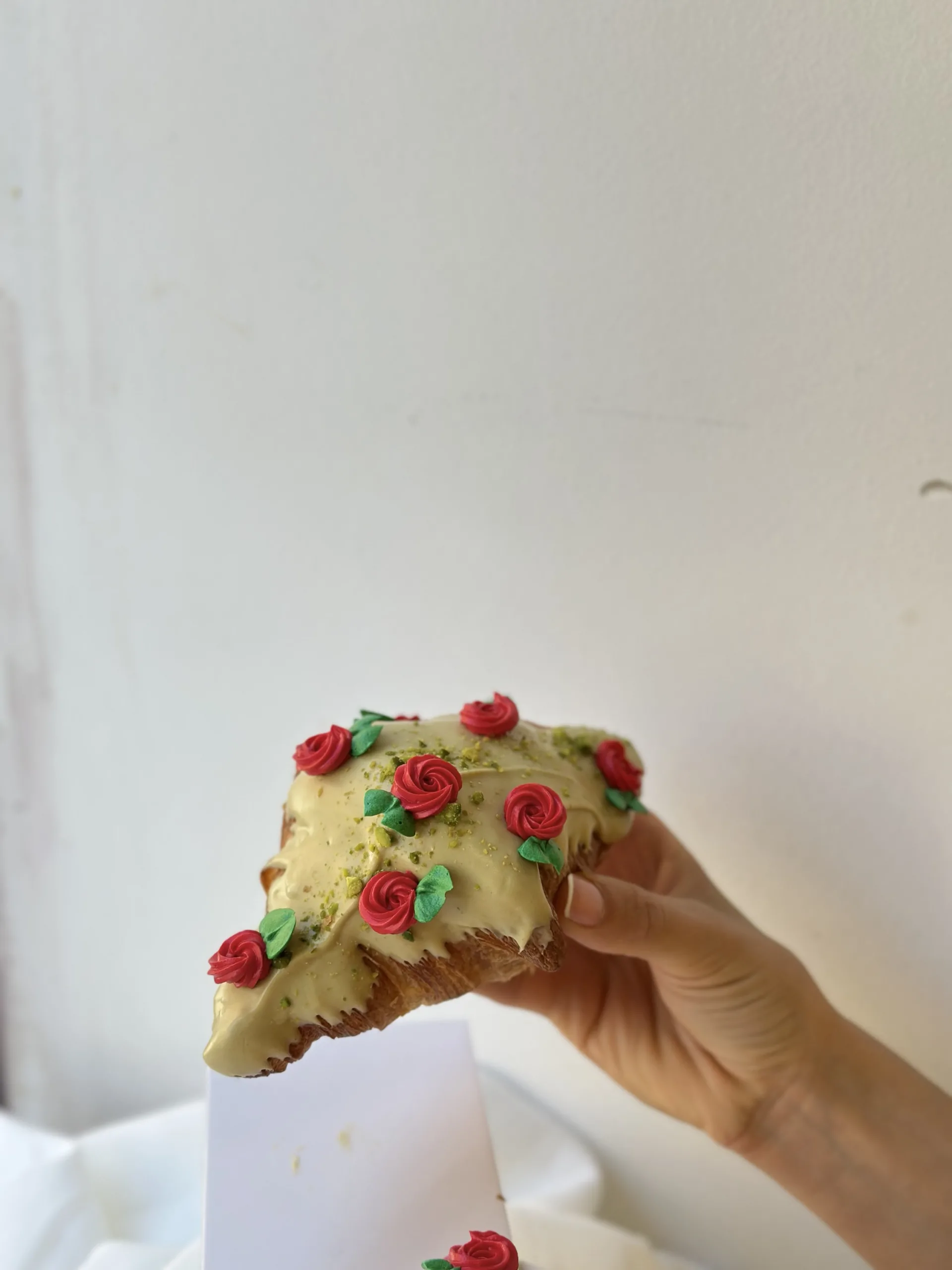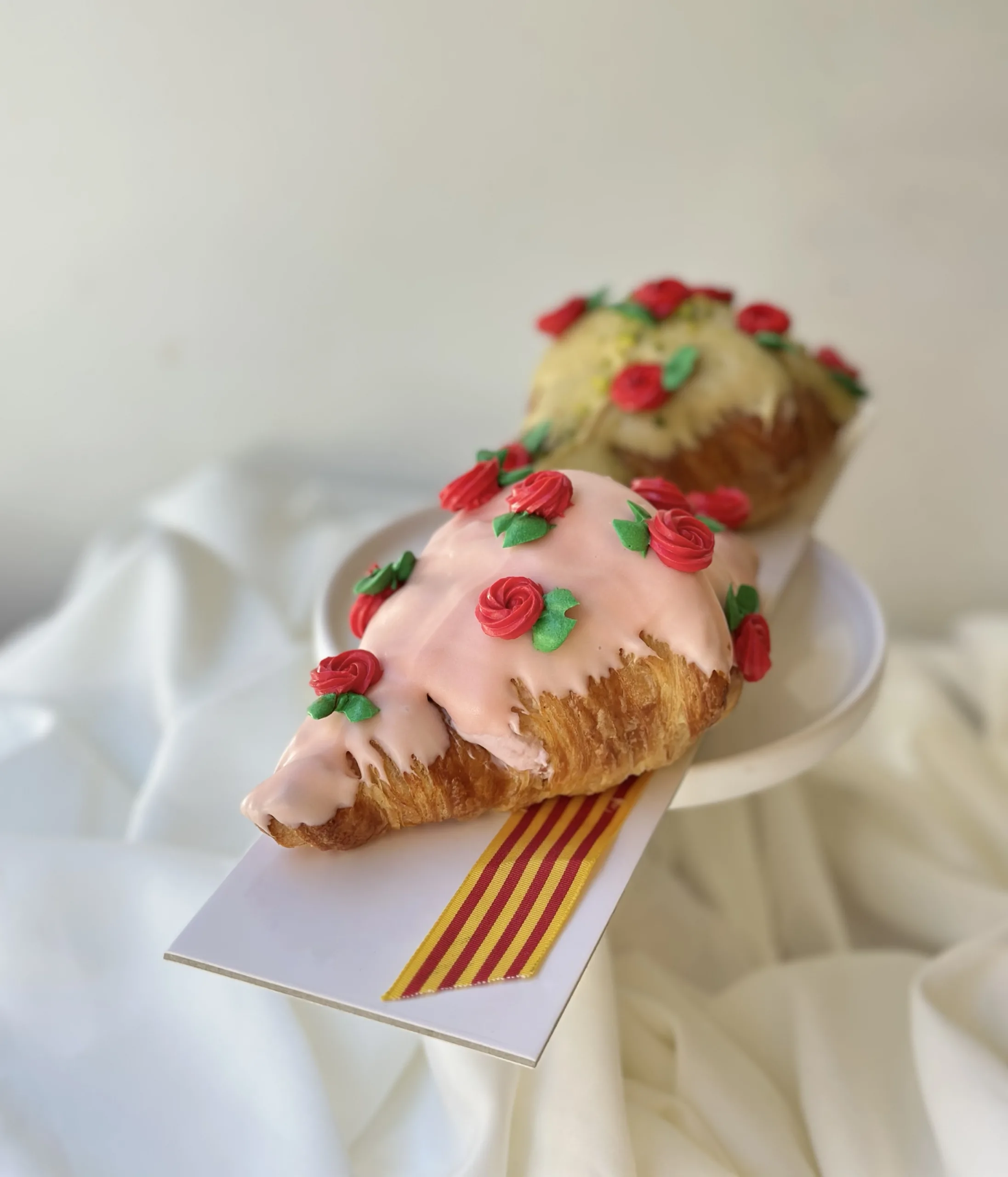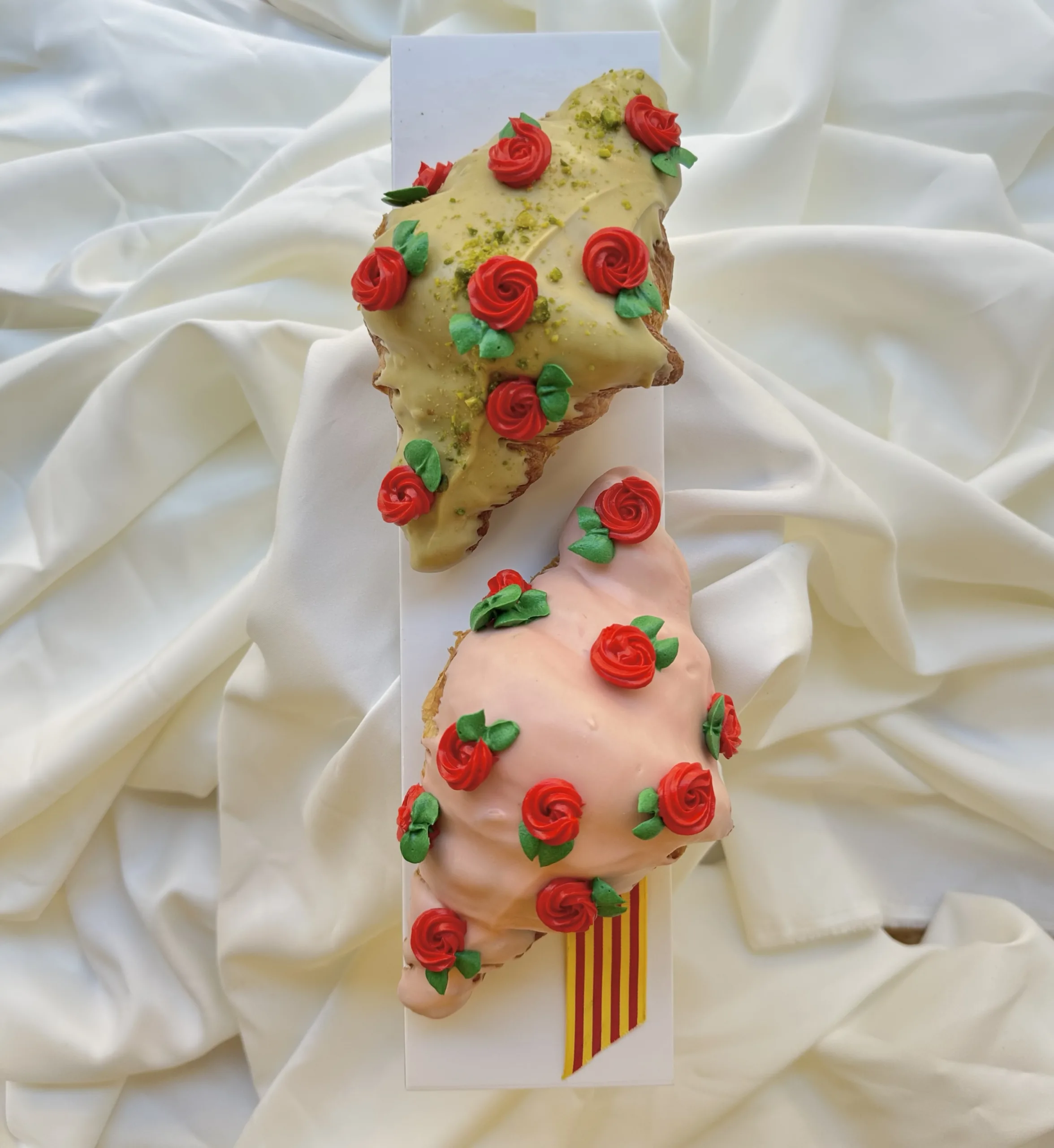 Duo croissant pistacho y croissant frambuesa, decorado con rosa roja, pack indivisible.