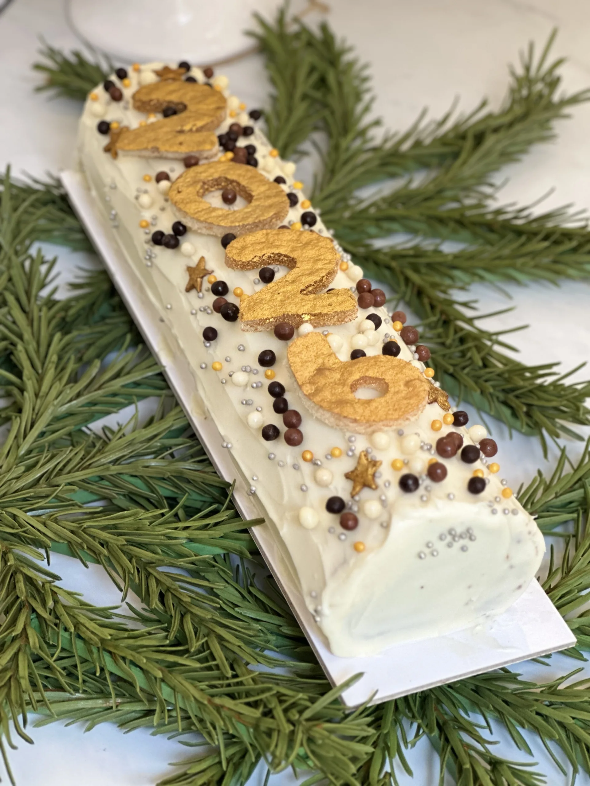 Tronco de año nuevo, bizcocho clásico relleno y cubierta de nata (foto) o relleno y cubierta con crema de choco avellana. Entra en el nuevo año de la manera mas dulce.
